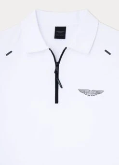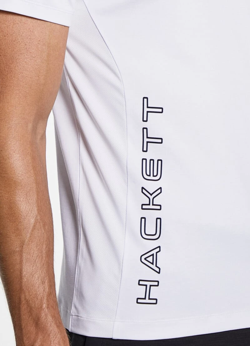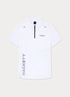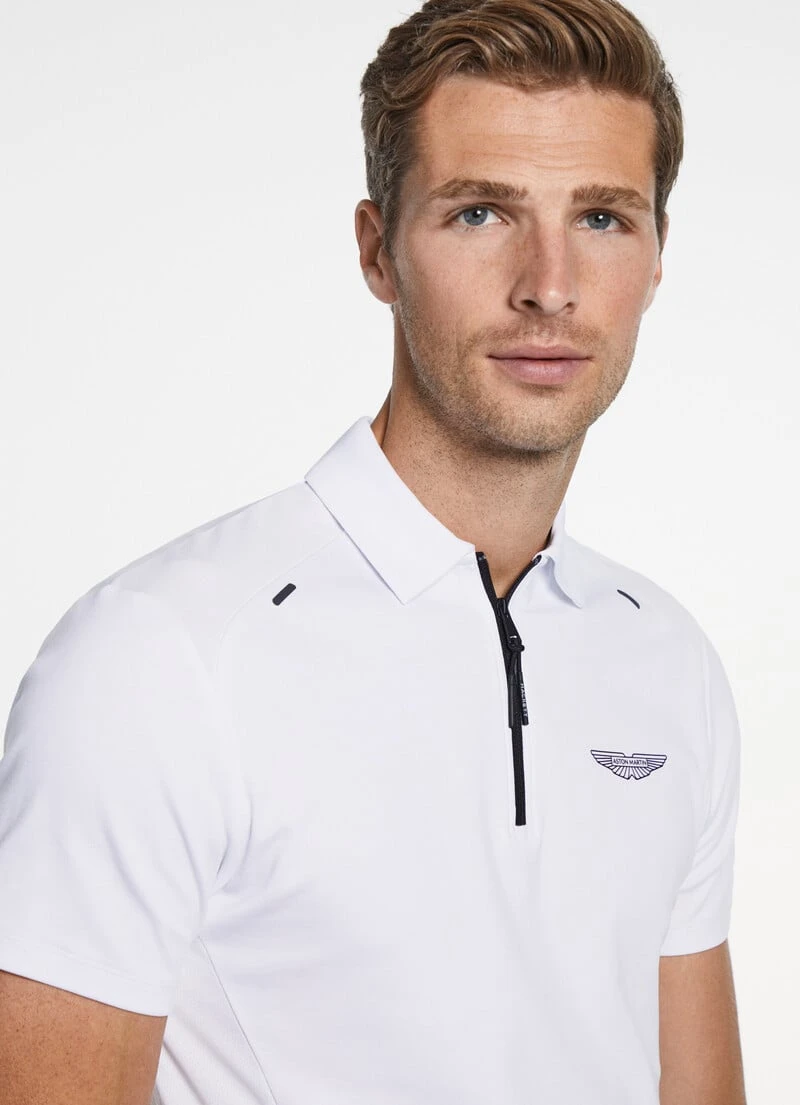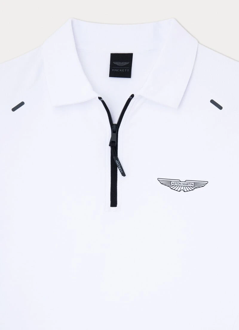 This uniquely styled polo shirt comes in a cotton interlock fabric and breathable mesh in matching tones at the side and on the shoulder seams. The garment features heat label details on the shoulder and a front zip with HS zip pull. It is complemented by the silicone AMR logo on the left chest and a HACKETT print on the side.
