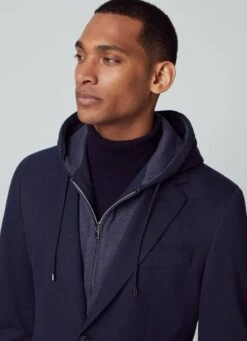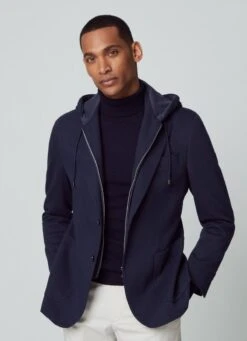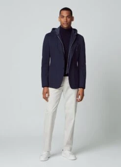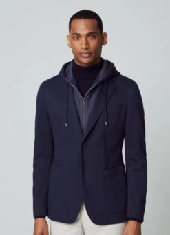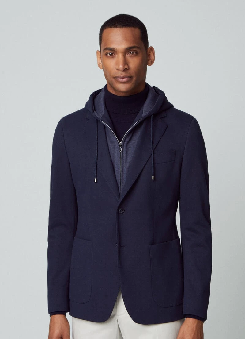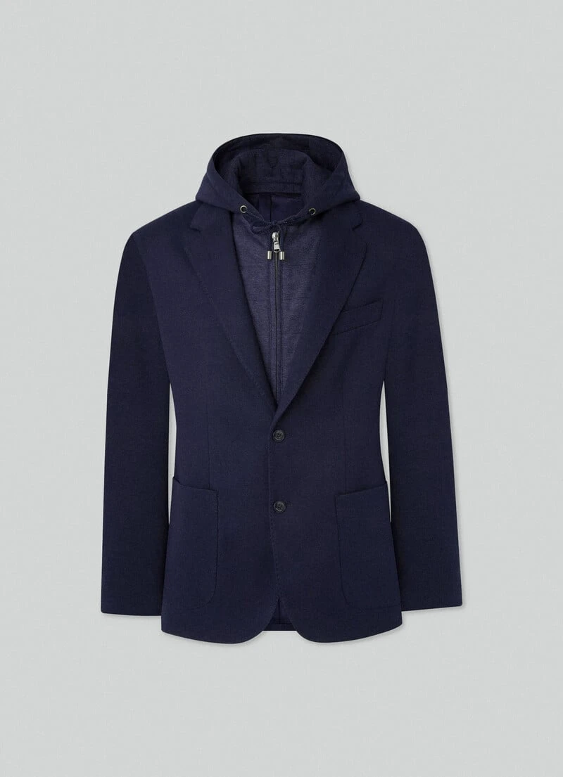 Crafted in a stretch jersey cotton fabric, this blazer stands out due to the eye-catching detachable bib design and drawstring hood for a more casual look. The AMF decorative seams and contrasting premium fabrics make this blazer a must-have in your wardrobe.