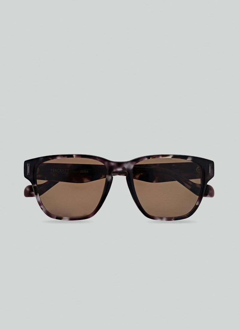 A retro take on the Clubmaster look, these sophisticated sunglasses feature Jeremy Hackett’s signature on sleek black tortoiseshell.