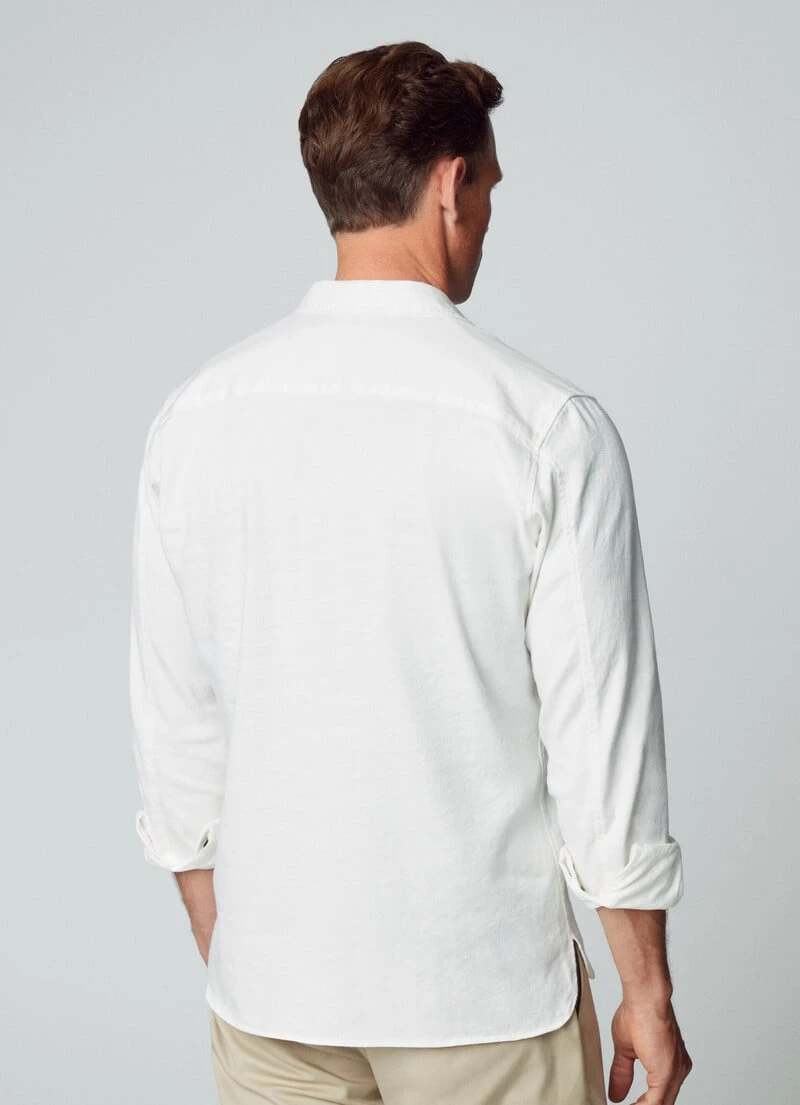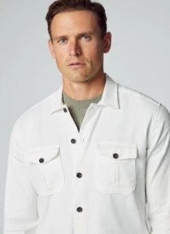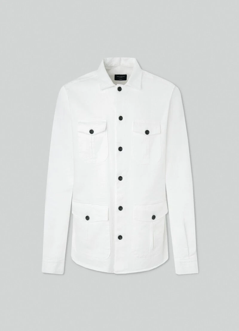 Crafted in a linen and cotton denim fabric, this overshirt is a lightweight and functional option for cool spring days. With an ecru wash for a softer feel, this garment is distinguished by the multiple flap pockets on the front for a casual and utilitarian look.