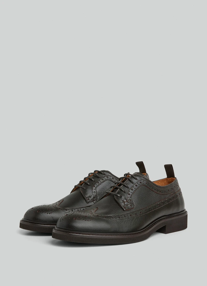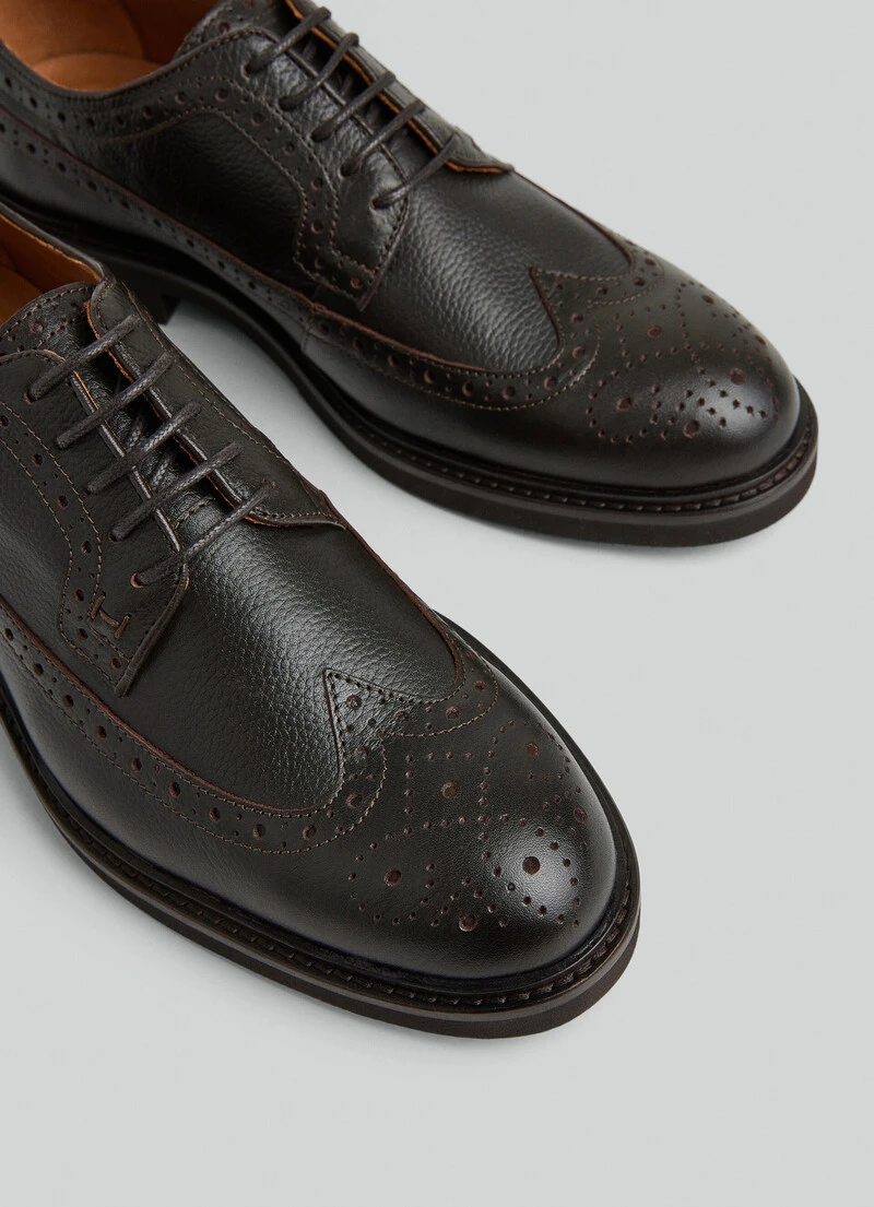 These classic derby shoes in cowhide leather are characterised by their brogue details on the toecap and sides, hand-stitching, and a stylish EVA sole for better traction. Pair these shoes with one of our three-piece suits from the latest collection.