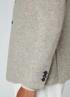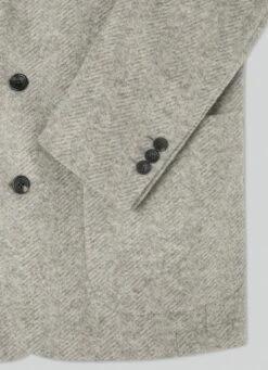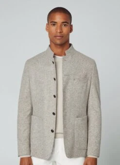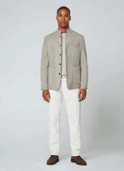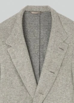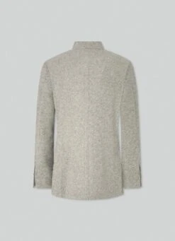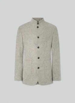 Crafted in a brushed herringbone weave, this blazer combines sophisticated tones in its palette. Details such as the innovative high collar, a no interior lining design and the side patch pockets offer a casual touch to your outfit without losing the elegance that characterises the garment.