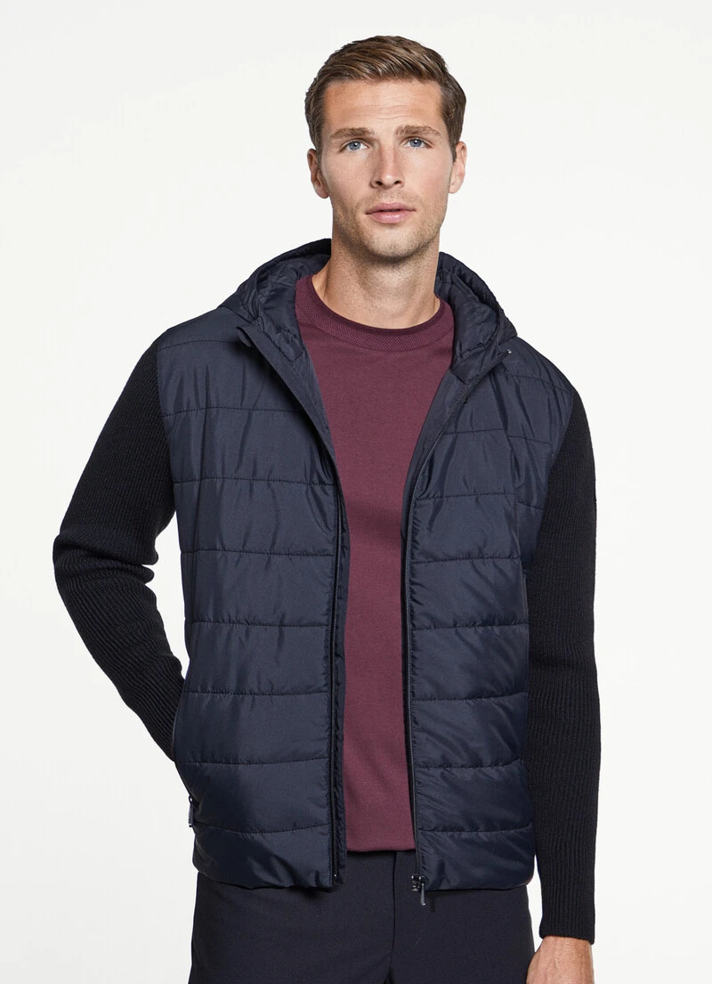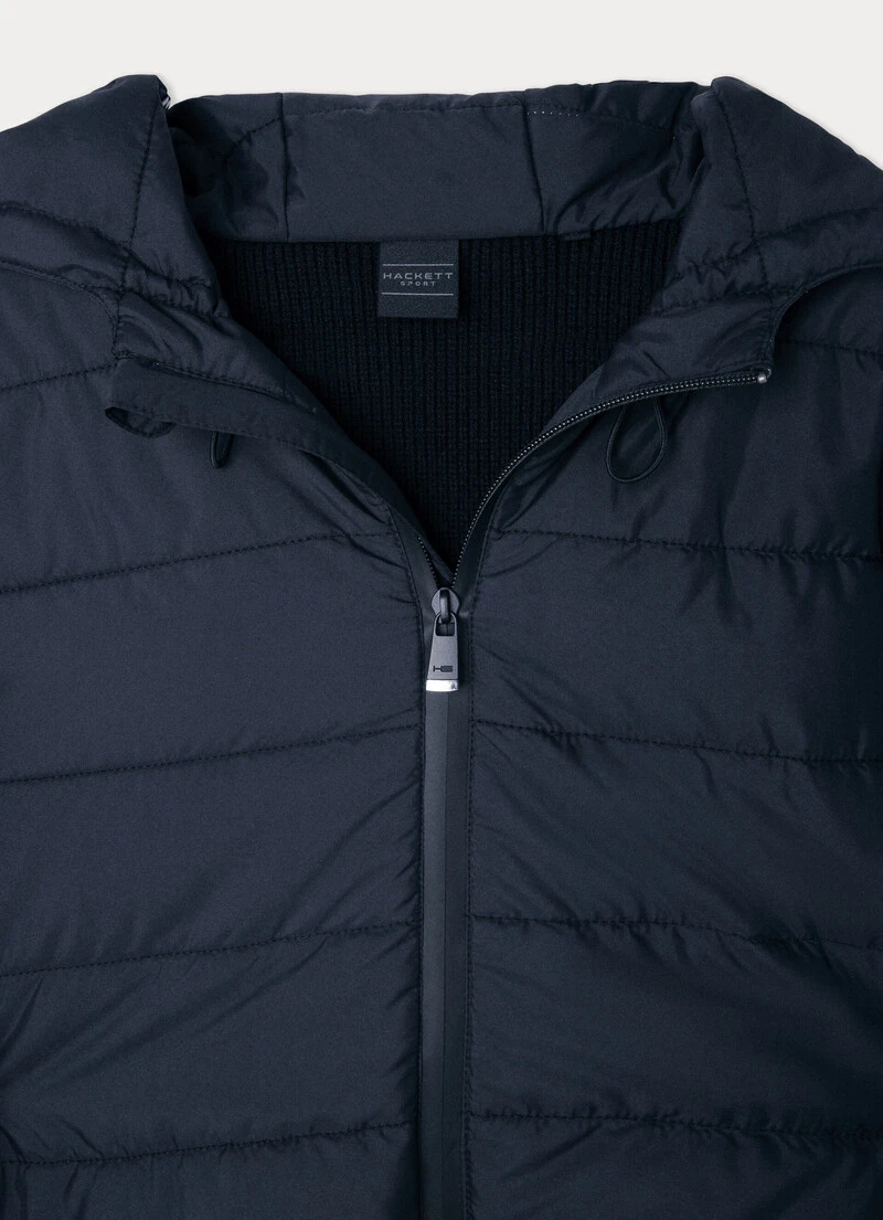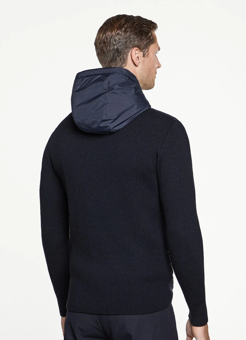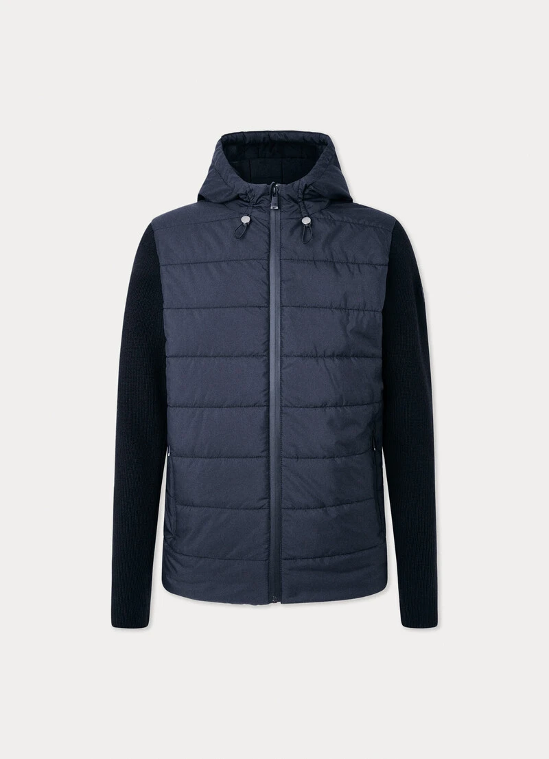 This hybrid knit jacket crafted in a ribbed merino wool fabric contrasts perfectly with the matte, quilted front panel. Details such as the water-resistant tonal zip fastening and adjustable drawstring hood complete this ideal garment to use as an outer layer for the coldest days of autumn.