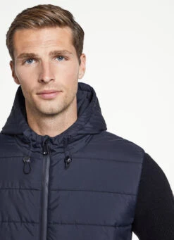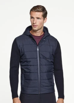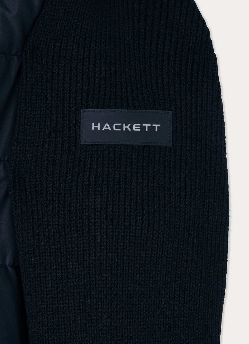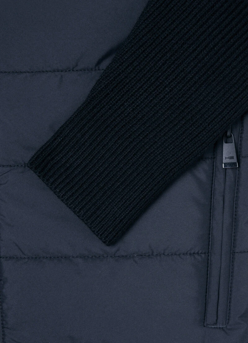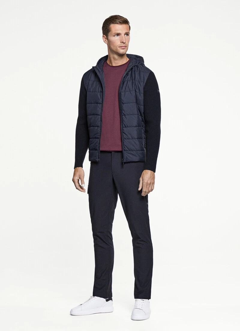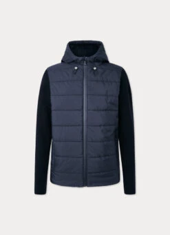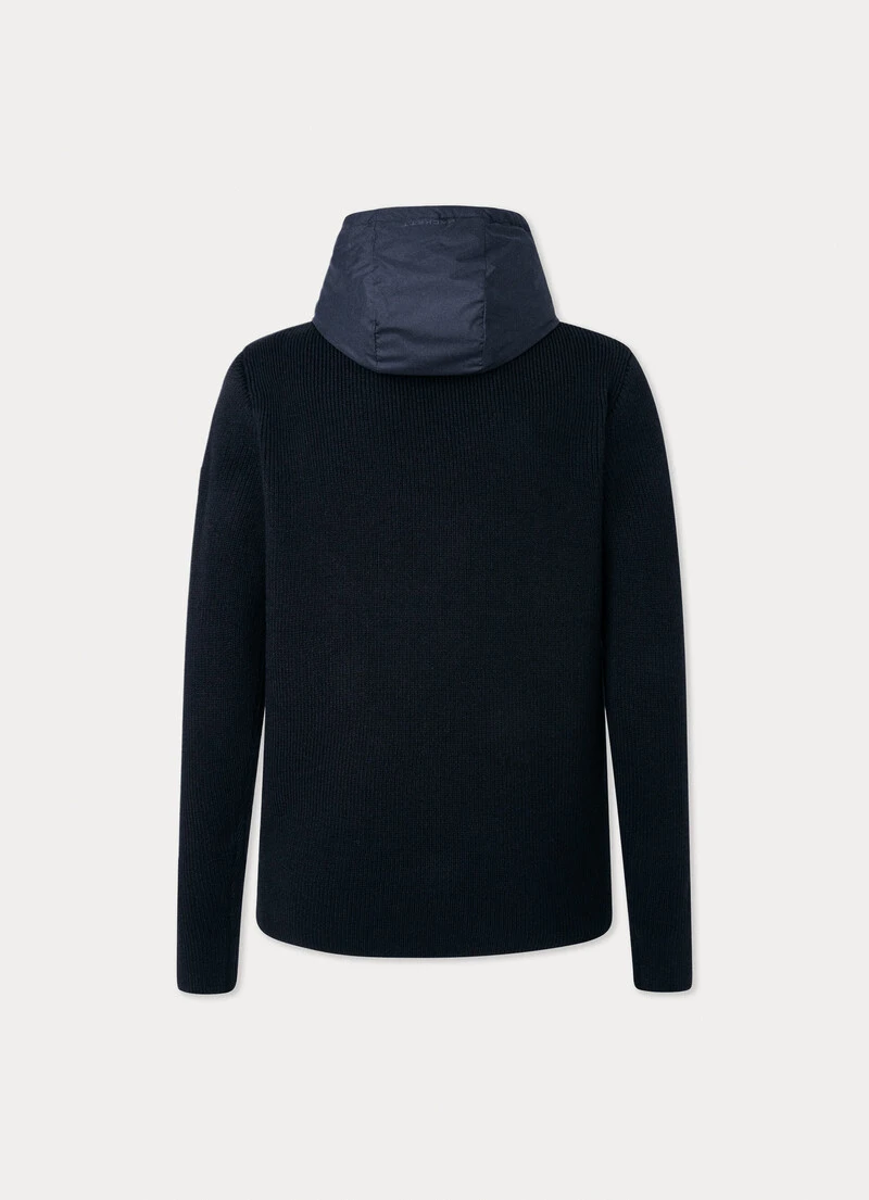 This hybrid knit jacket crafted in a ribbed merino wool fabric contrasts perfectly with the matte, quilted front panel. Details such as the water-resistant tonal zip fastening and adjustable drawstring hood complete this ideal garment to use as an outer layer for the coldest days of autumn.