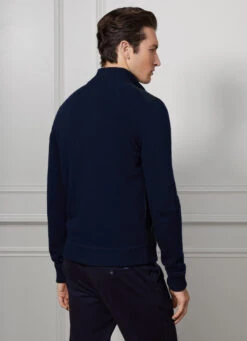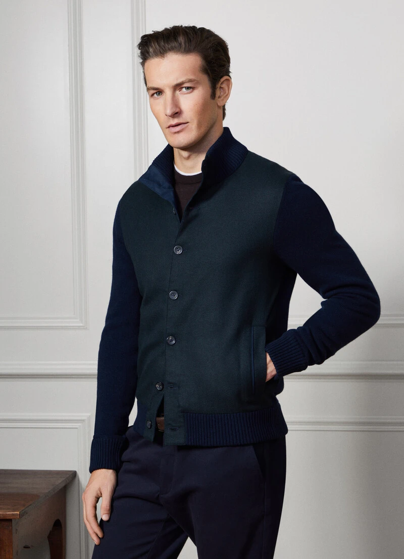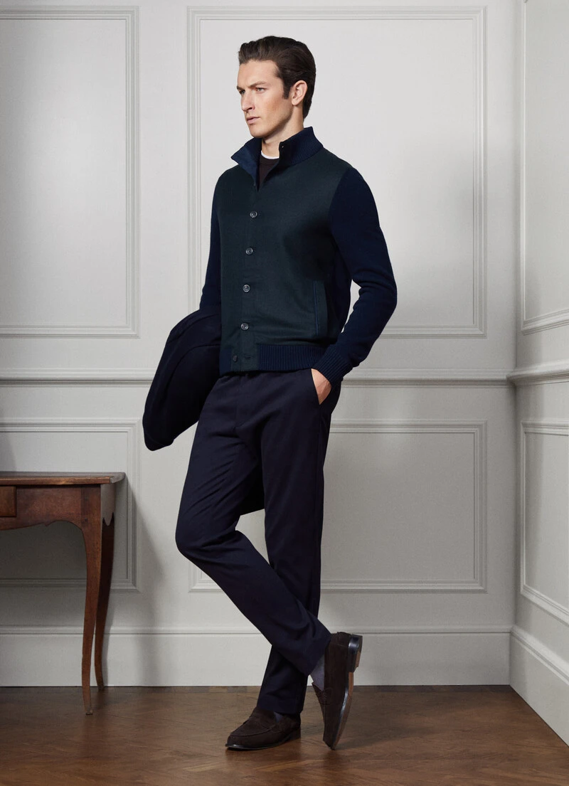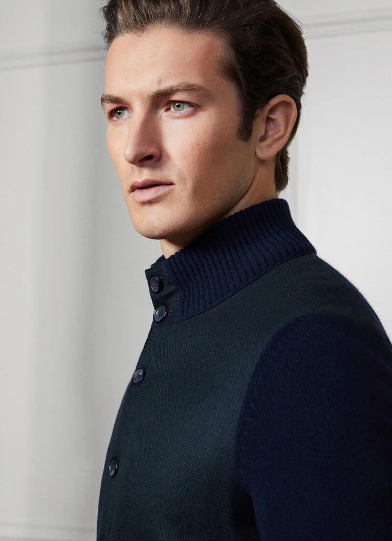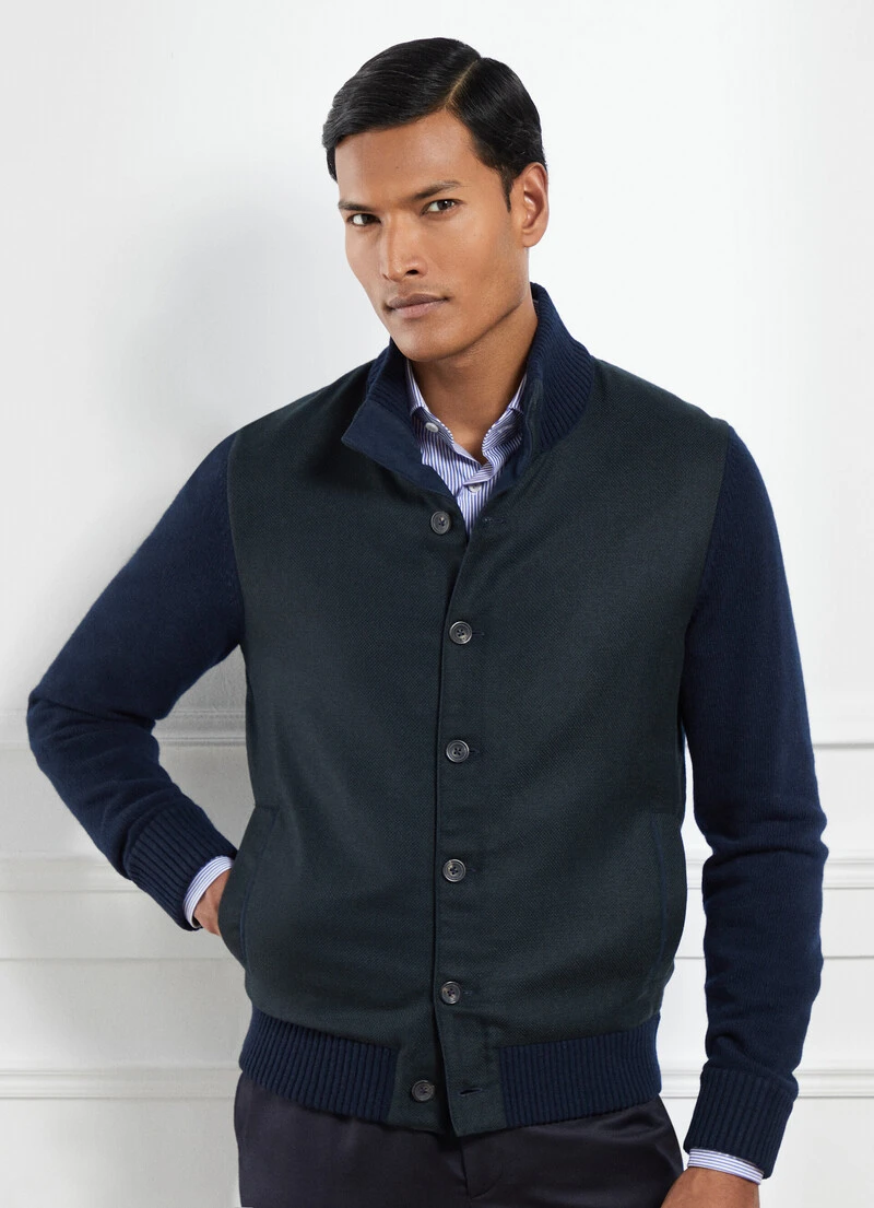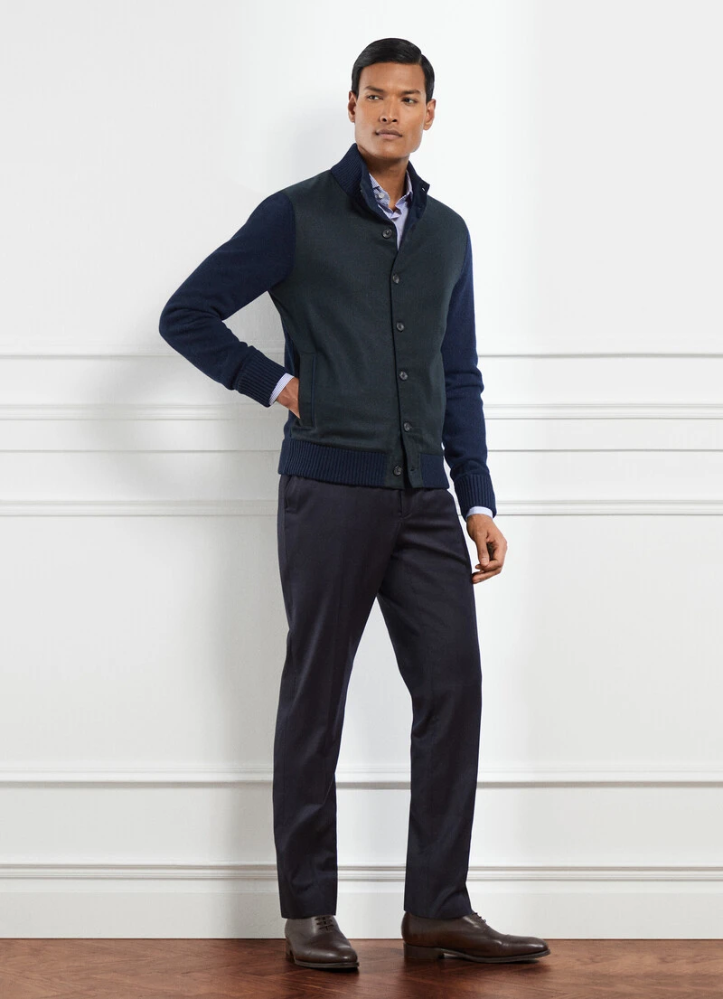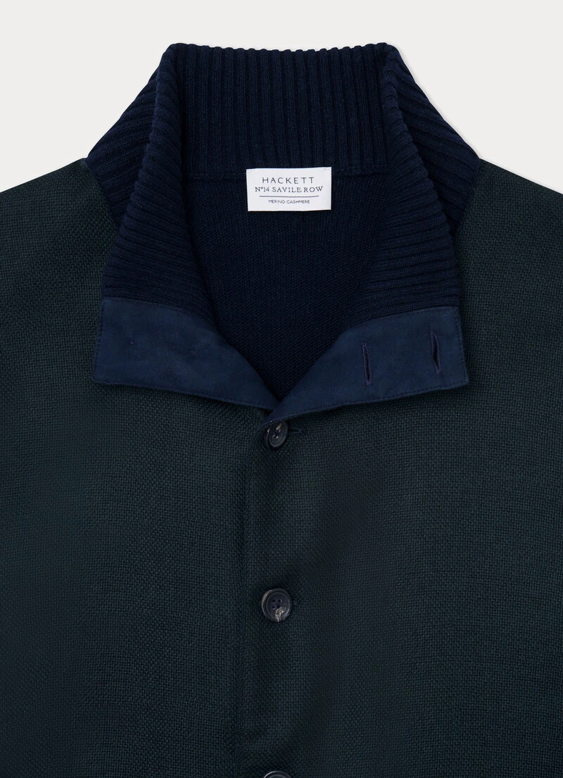 This hybrid jacket from our Savile Row collection combines soft Italian hopsack fabric with warm mercerised merino wool. Features such as the Milano stitch finish on the back and sleeves, alcantara details on the pockets and elegant horn buttons complement the superb design of this garment.