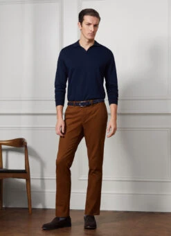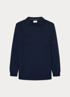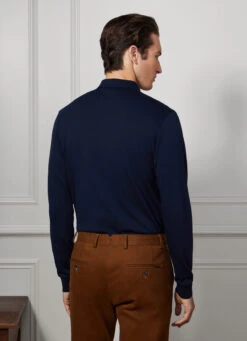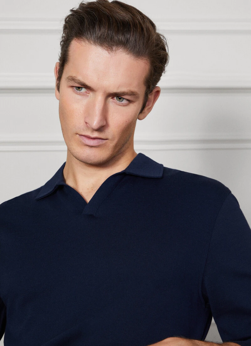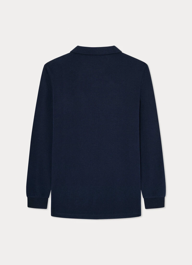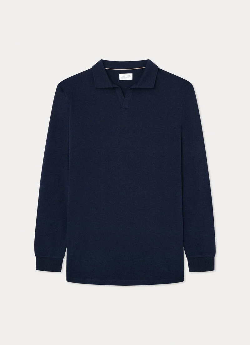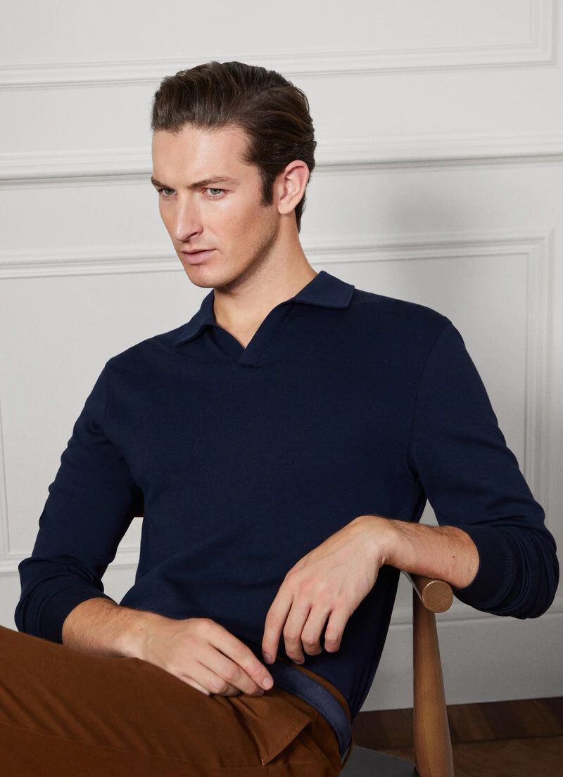 This long-sleeved polo shirt in piqué fabric made of a wool and cotton blend from our Savile Row collection stands out for its relaxed style with an open collar, elegant alcantara side seams and mother-of-pearl buttons.