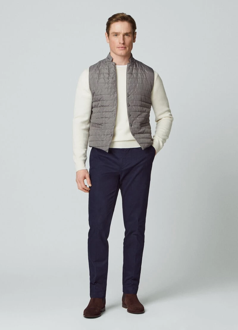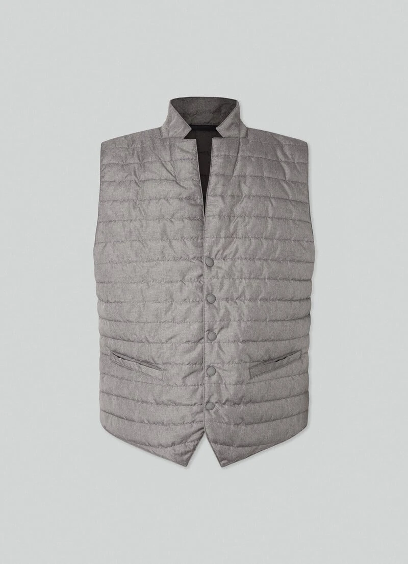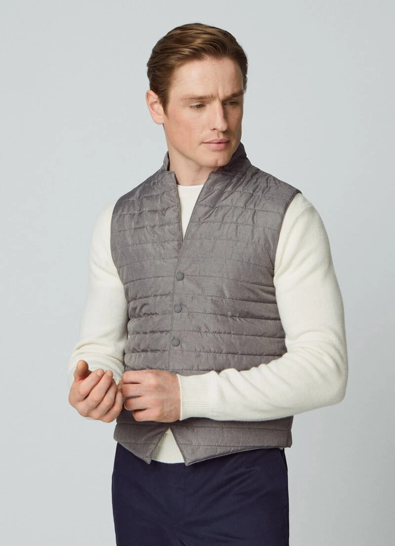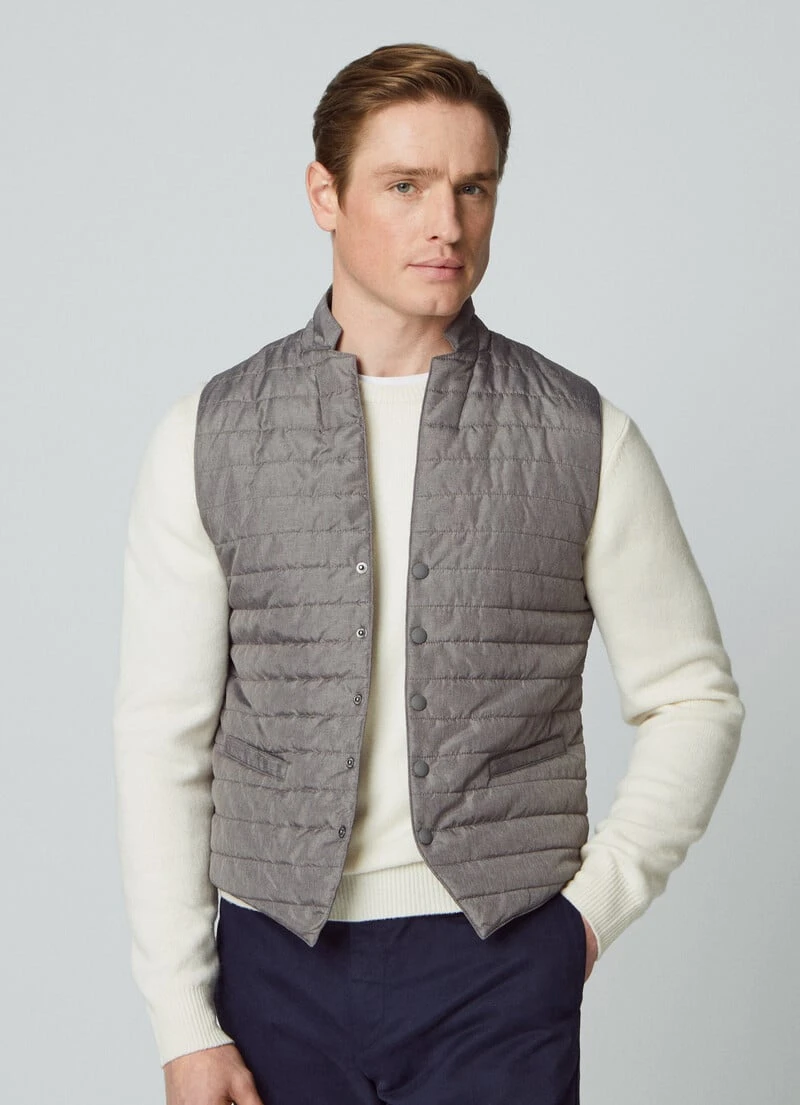 This gilet mixes classic elegance with an Edwardian aesthetic. Made of matte melange nylon, the garment stands out due to the padded structure combined with a classic notch lapel, which gives it a stylish look. This item is perfect for layering with other garments from the new Hackett collection.