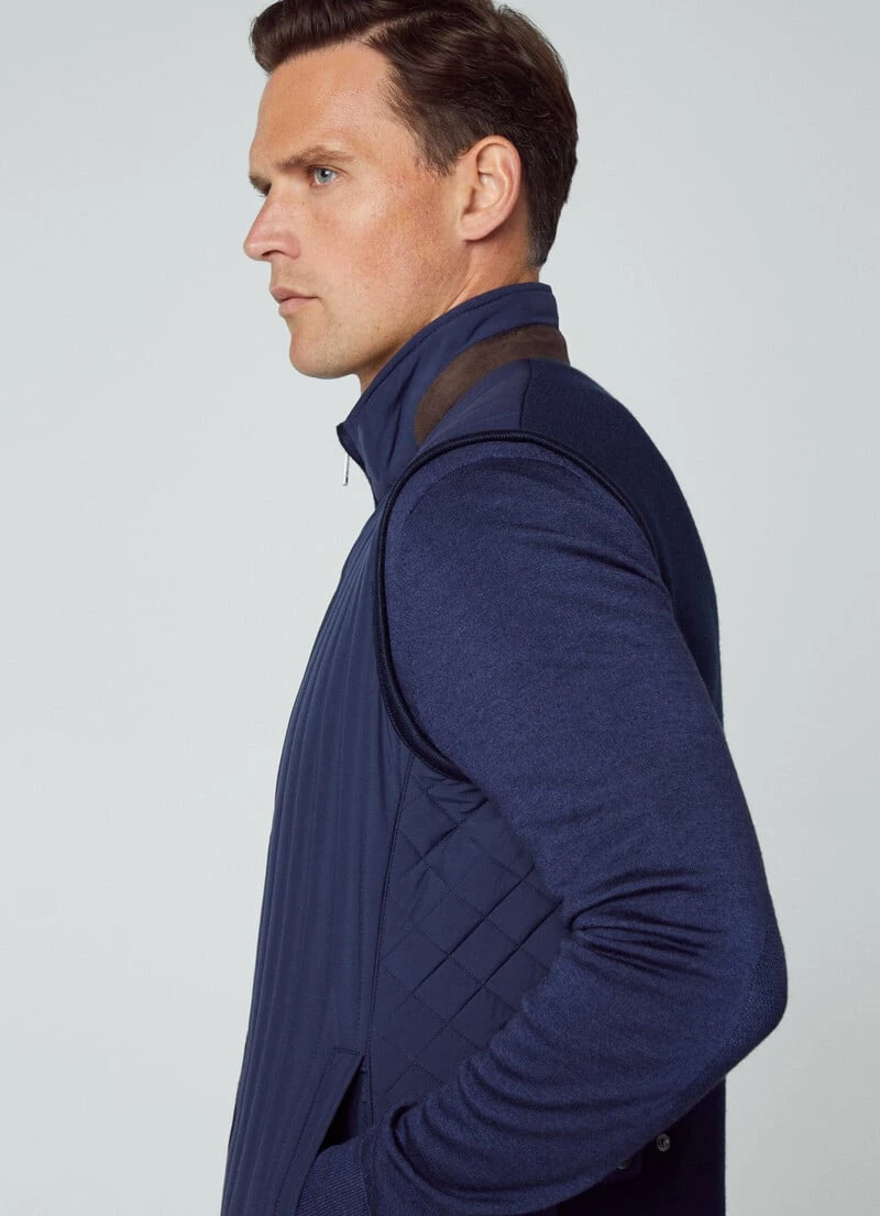 This gilet is a versatile and stylish garment that combines a water-resistant nylon front panel with quilted side panels and a tricot fabric on the back. The light padding and two-way front zip make it ideal for cold and windy days.