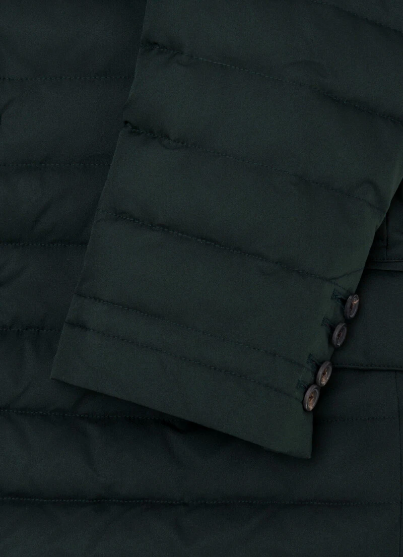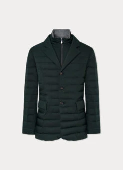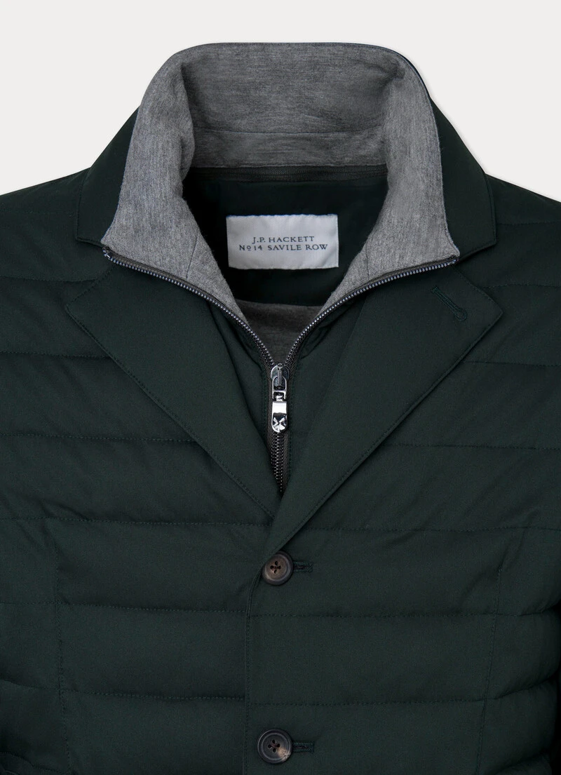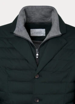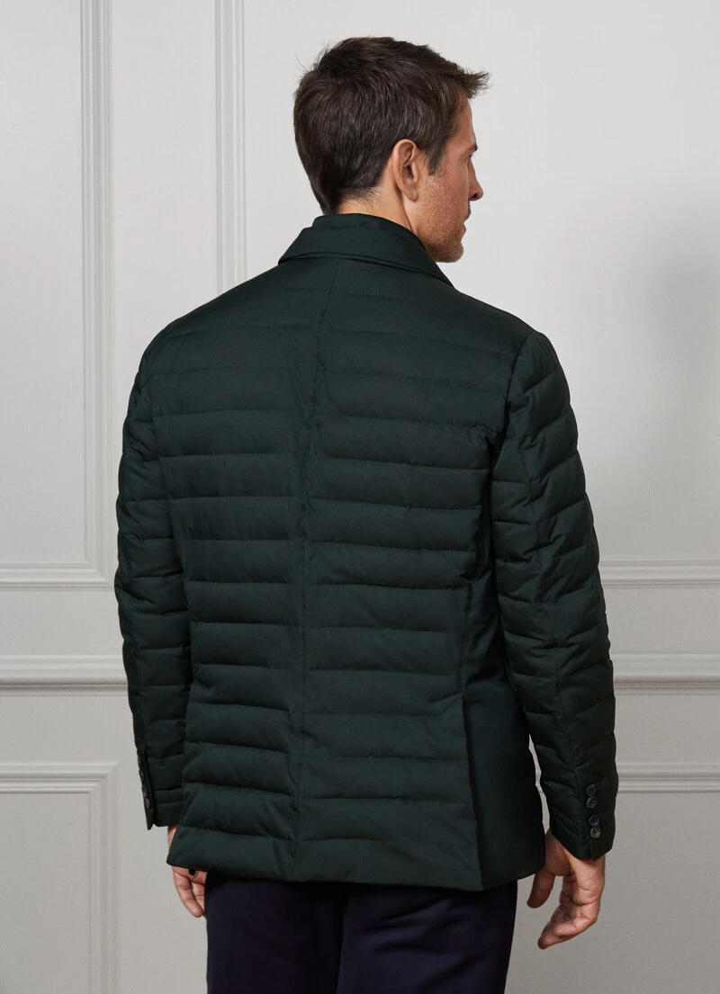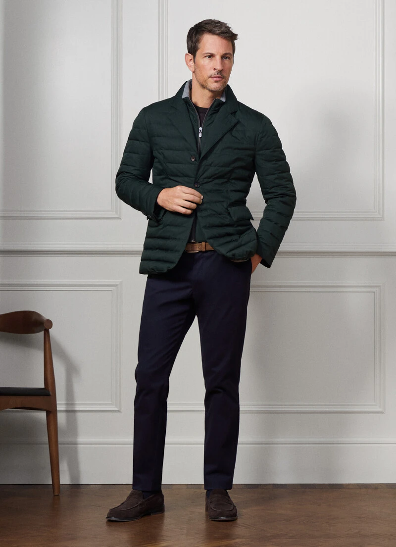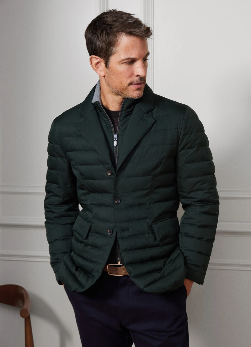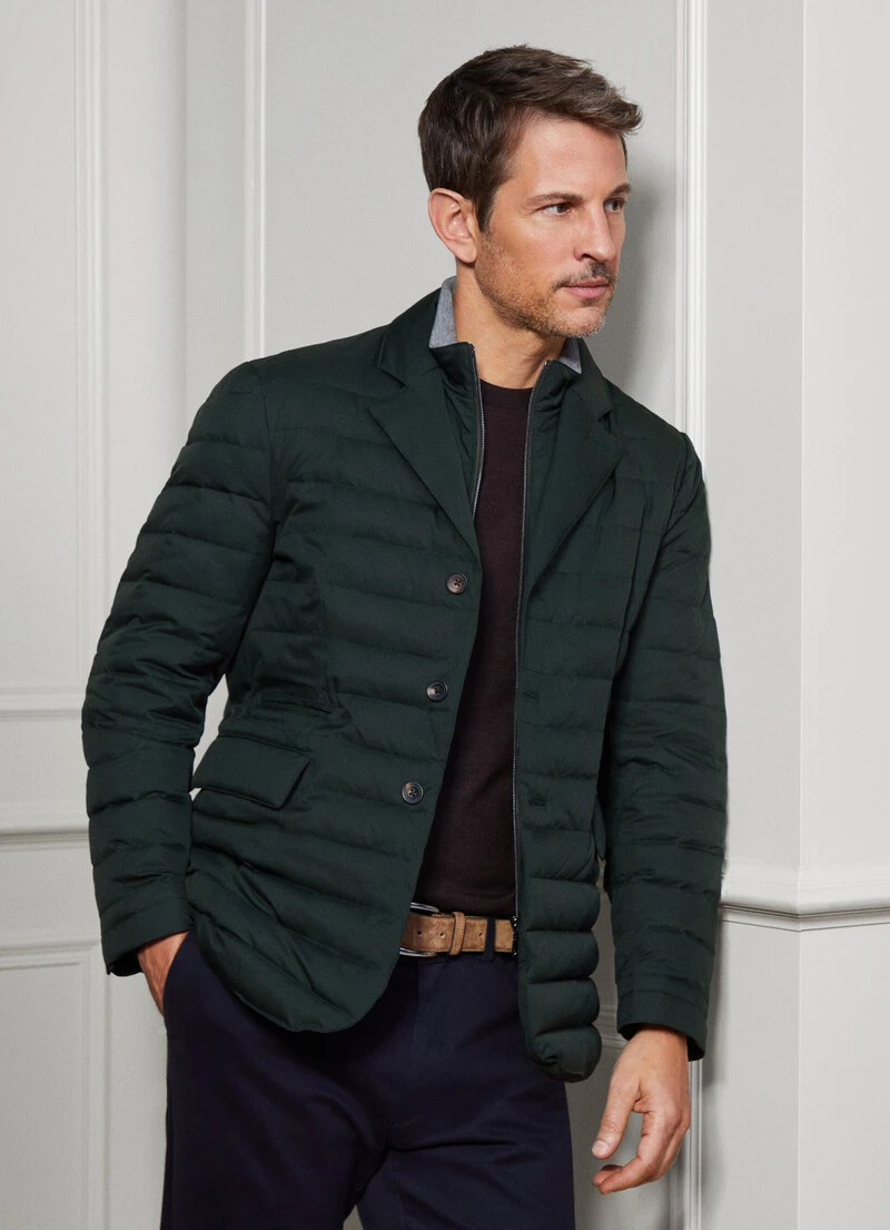 This padded hybrid jacket from the Savile Row collection comes in a water-repellent fabric and is characterised by a practical removable bib which, together with its ultralight structure, will provide warmth on the coldest winter days. Pair it with one of our seasonal jumpers for a stylish look.