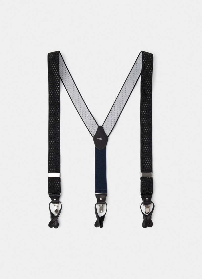 These elegant and innovative, stretchy combi braces with a polka dot print are handmade in England. The clever, adjustable design offers clip-on and button fastening, and contrasting leather details.