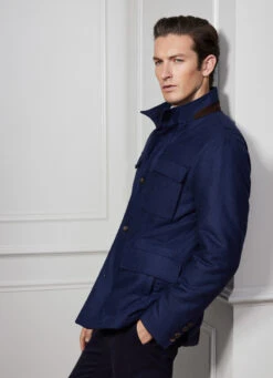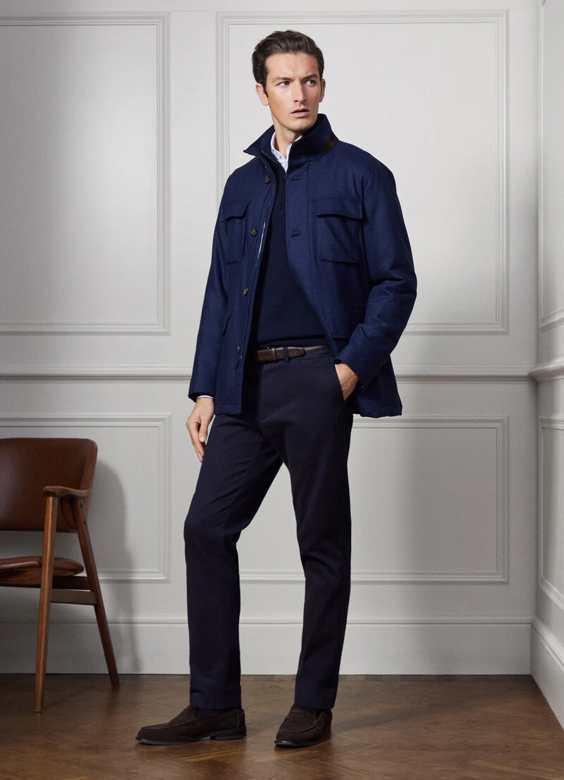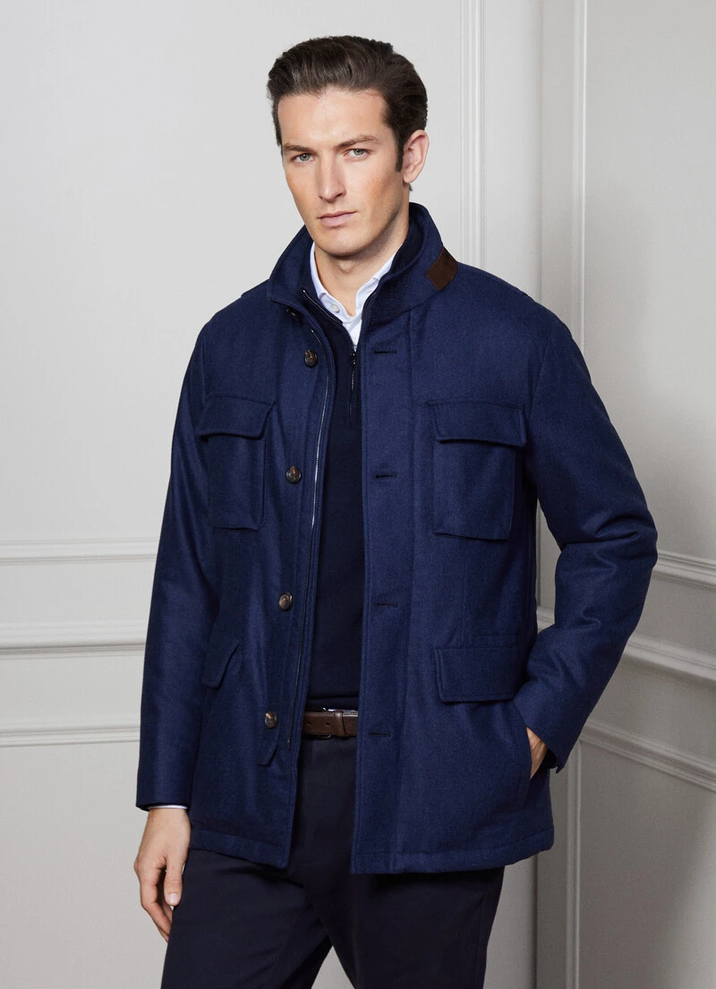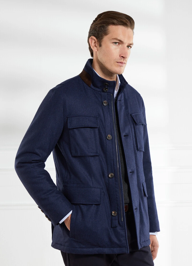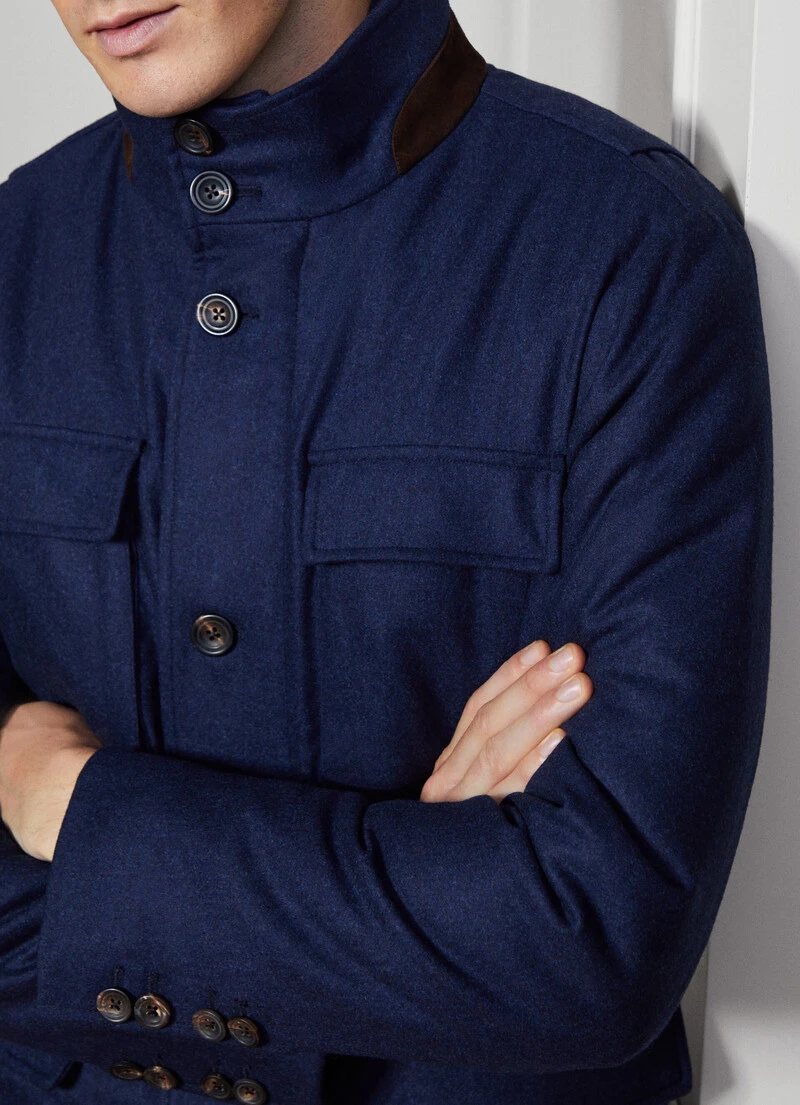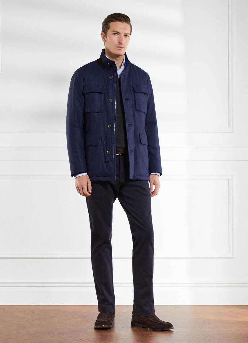 Crafted in a super-stretch Italian wool fabric, this jacket from the Savile Row collection stands out with multiple front patch pockets which give it a cargo style. This garment features front fastening with metal zips and buttons made of genuine horn to add a refined touch to the design.