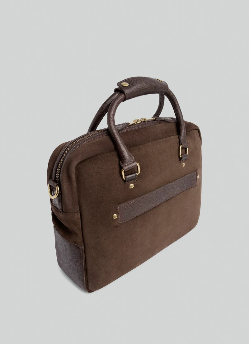 This laptop bag in suede with a leather trim features multiple interior compartments to secure all your devices and personal items. With this accessory, you can take your work anywhere in great comfort and style.