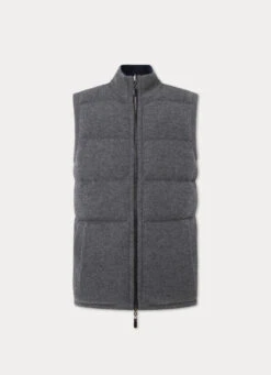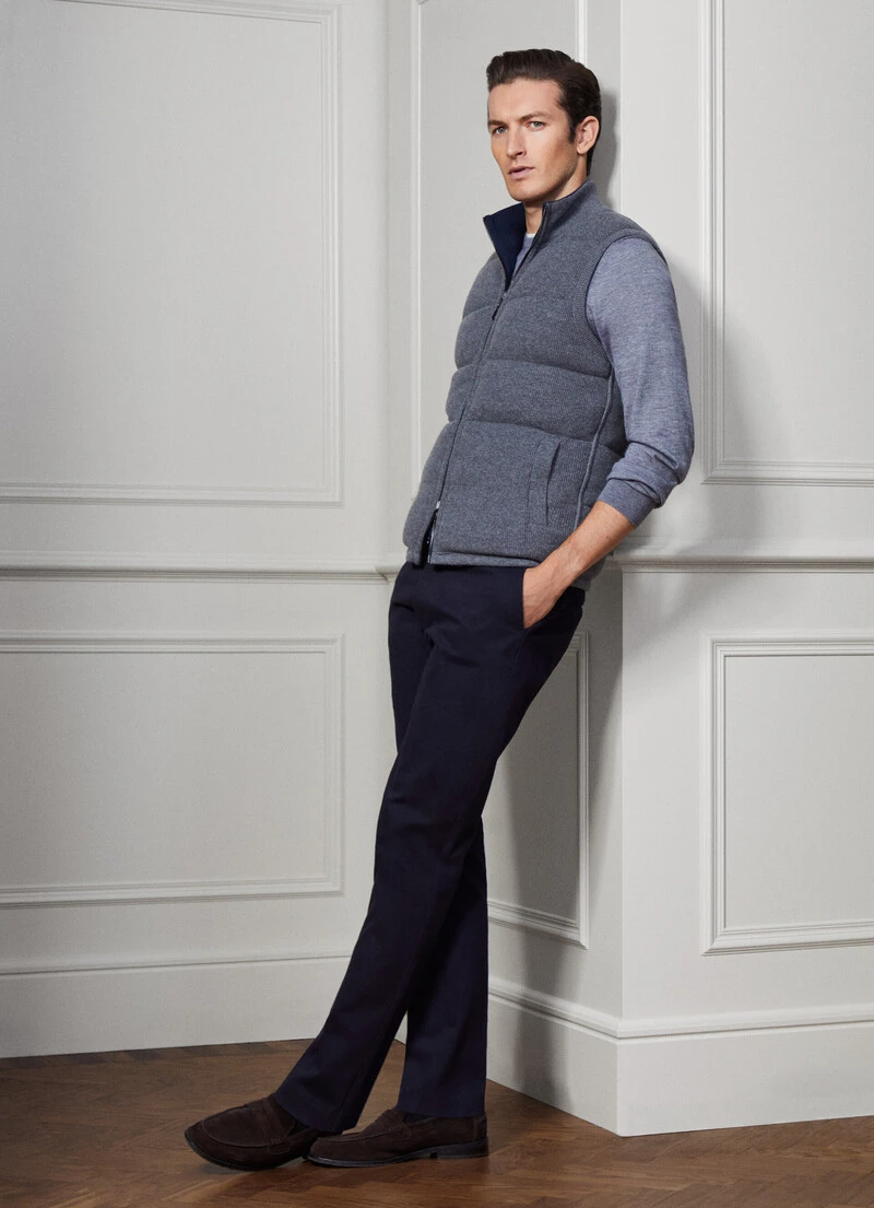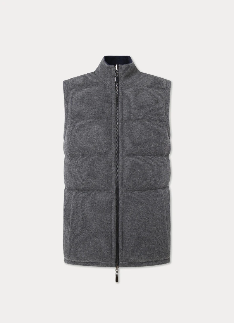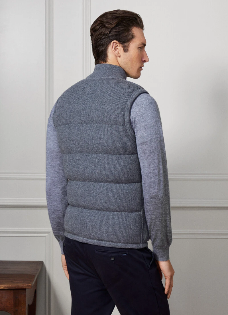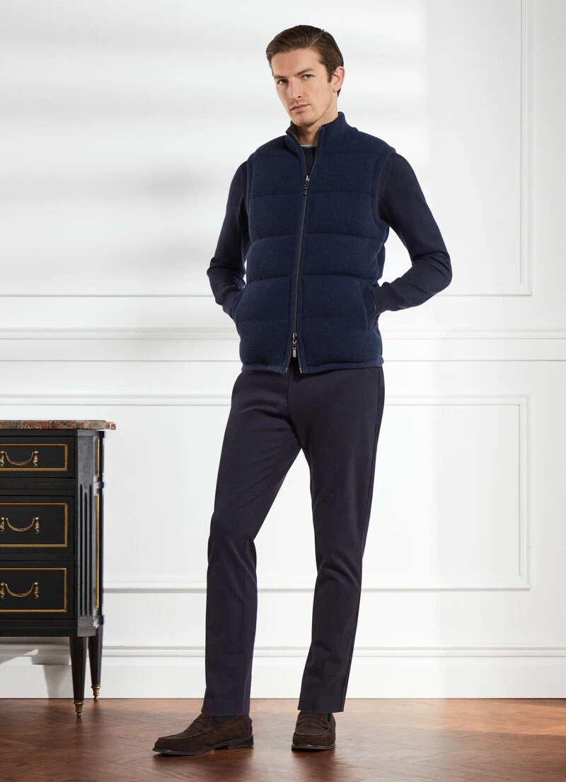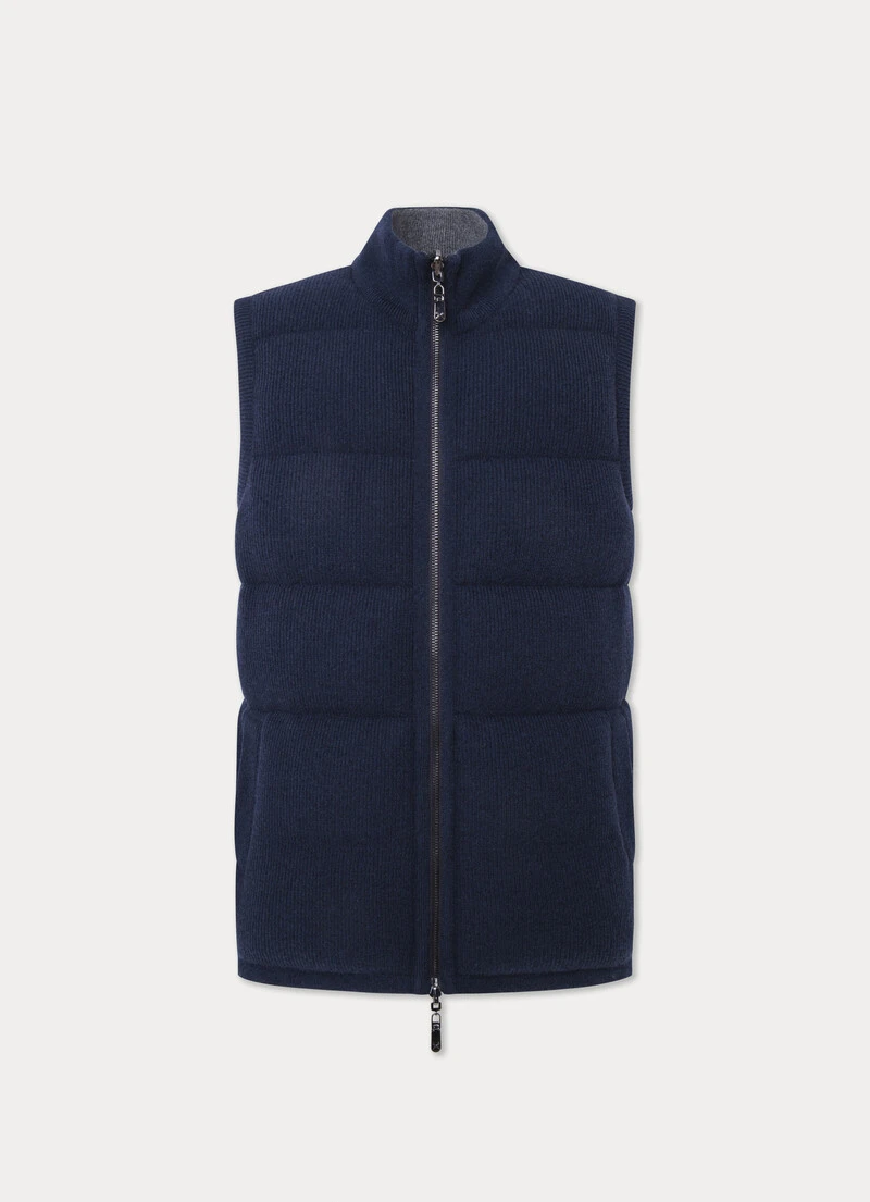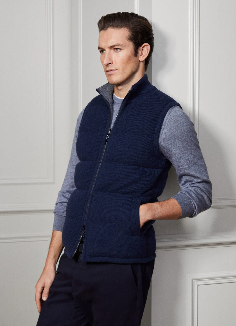 Crafted in a combination of fine wool and cashmere, this knitted gilet from our Savile Row collection is characterised by a two-tone, fully reversible and lightly padded design. Due to its versatility, this garment will keep you warm this winter season without compromising on elegance.