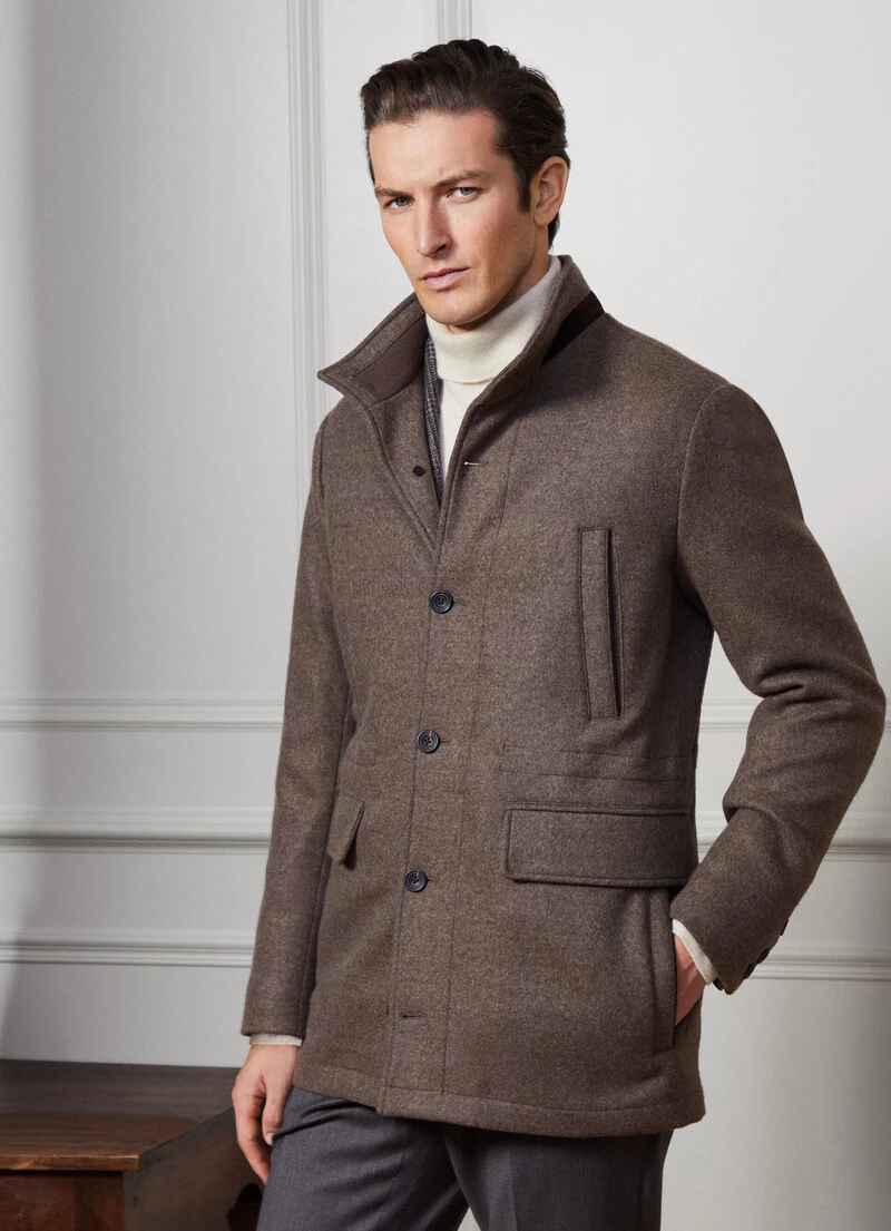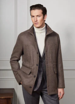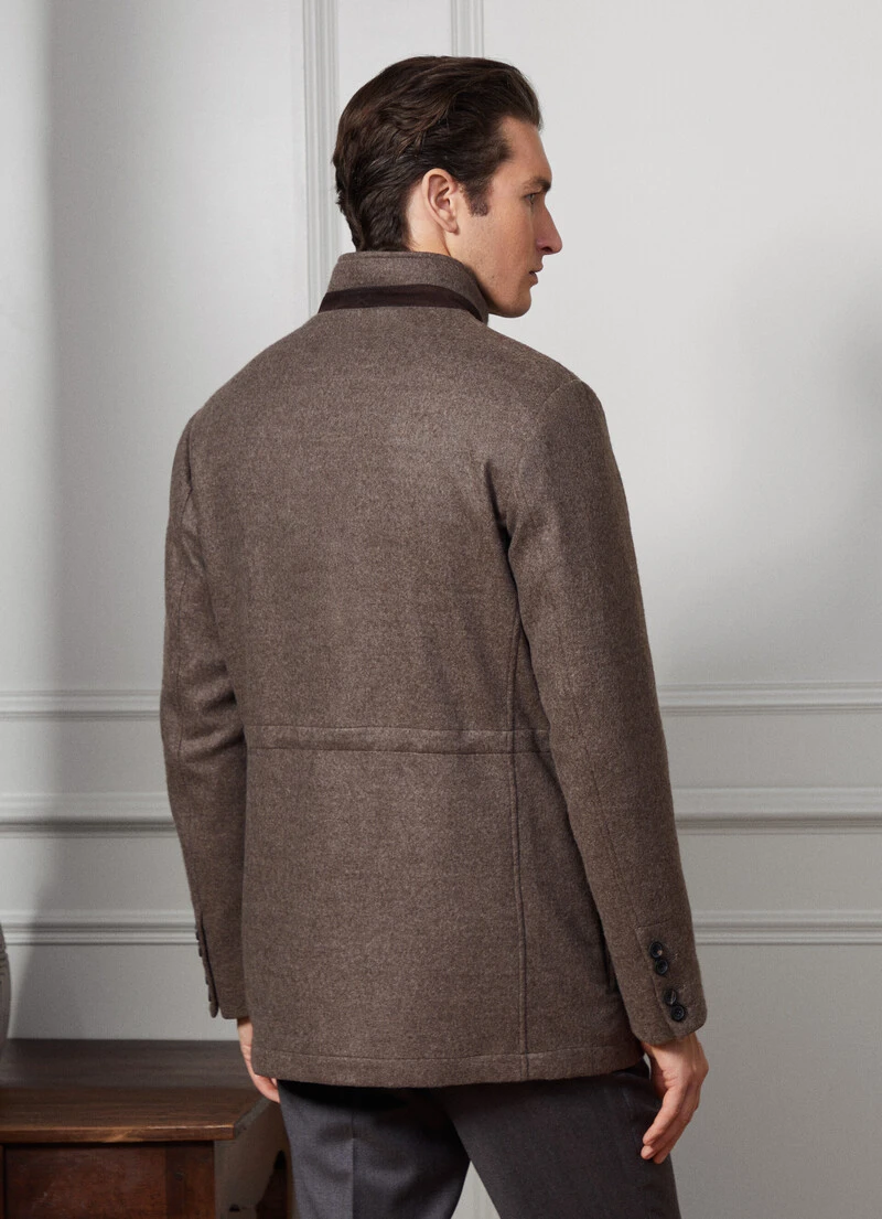 This jacket from the Savile Row collection is characterised by its manufacture of a particular Italian wool known as La Pecora Negra which gives it a unique and natural tone. In a utility style this garment features hand warmers at the chest and double-entry side pockets.